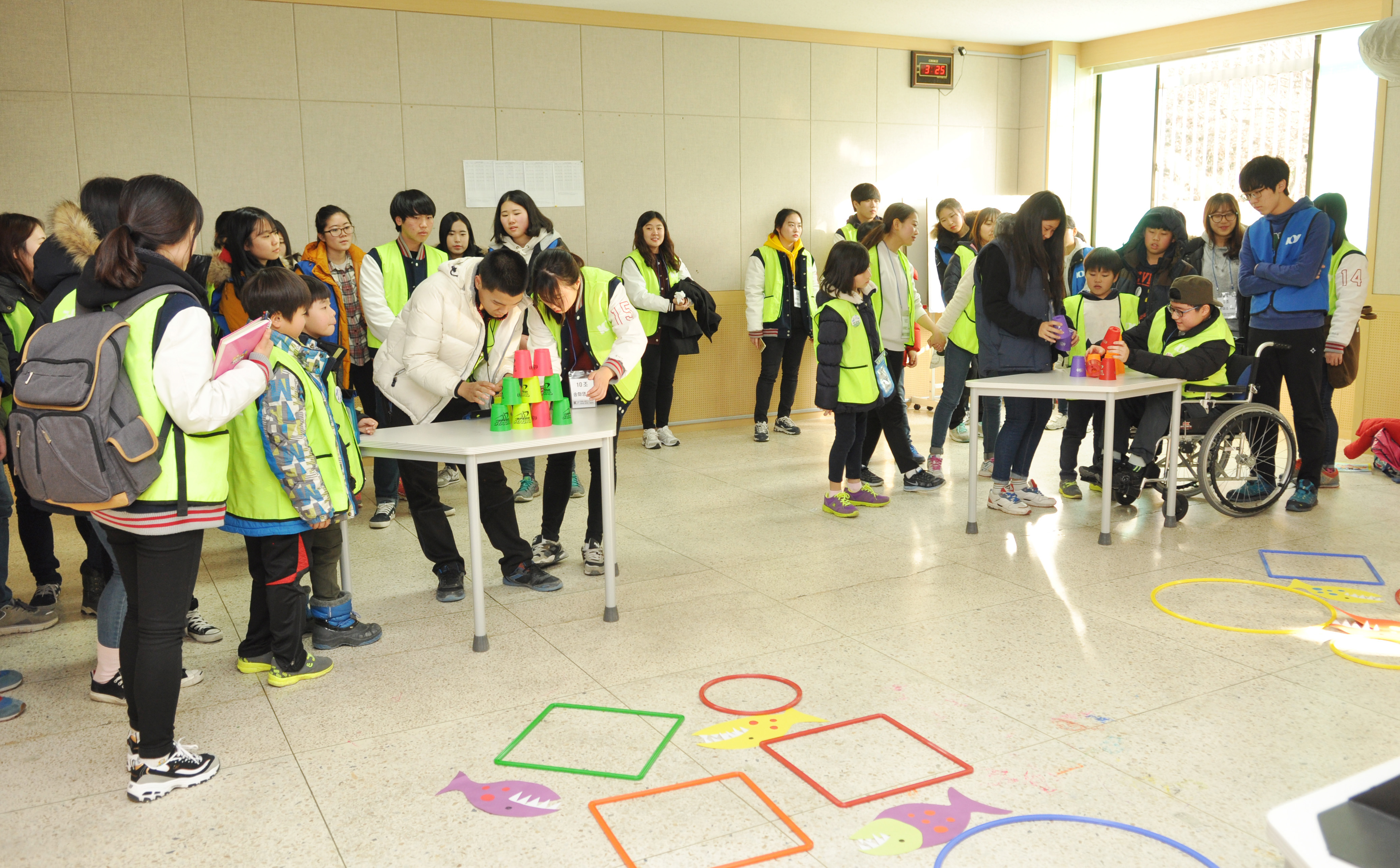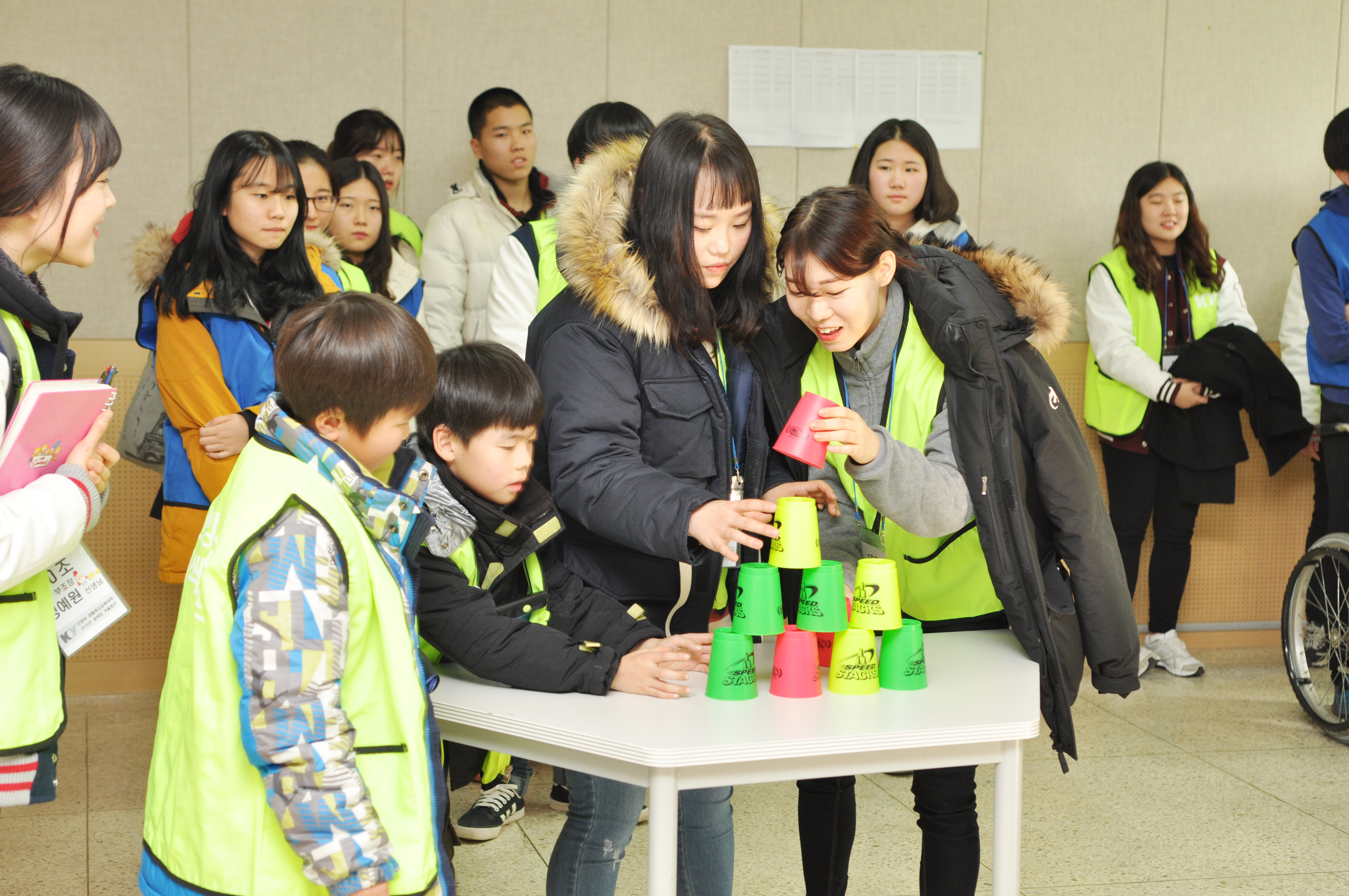 '지혜가 반짝 용기가 번쩍' 프로그램 중 컵쌓기 게임을 하는 모습.jpg