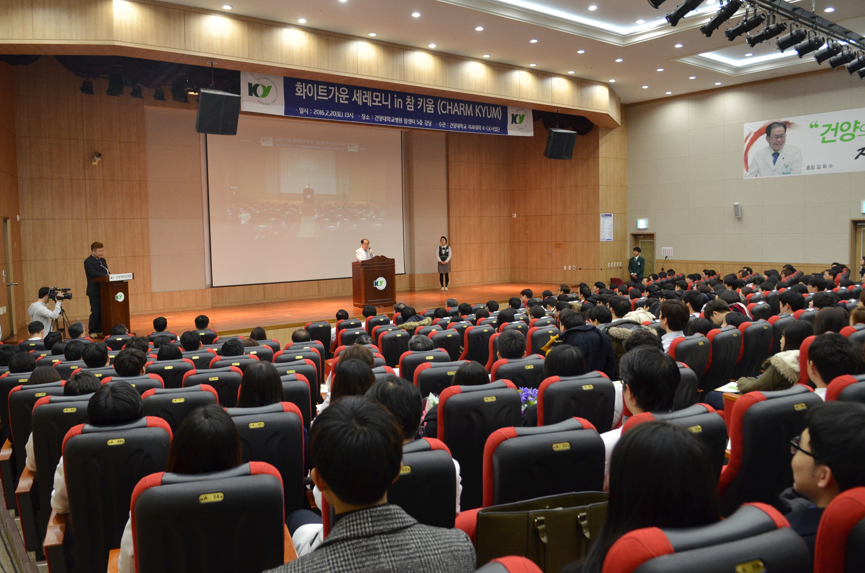 건양대 의과대학, ‘화이트가운 세레모니’ 개최 인술을 펼치는 참된의사로서의 길 다짐 건양대학교(총장 김희수)는 20일 건양대학교병원 암센터 5층 강당에서 의학과 재학생과 학부모, 교수 등 200여명이 모인 가운데 참된 의사로 가겠다고 다짐하는 ‘2016 화이트 세레모니’를 열었다. 화이트가운 세레모니란 건양의대 학생들이 중심이 되어 매년 개최하는 학과 전통행사로서 의과대학 5학년 학생들이 임상실습을 앞두고 의사의 상징인 흰가운을 입고 예비의사로서 명예와 자부심을 다짐하는 자리다. 이날 세레모니에서 건양대 김희수 총장과 건양대 최원준 의과대학장이 직접 학생에게 횐가운을 입혀주는 것을 시작으로 의과대학 모든 교수들이 학생 한명 한명에게 직접 화이트가운을 입혀줬다. 또한 재학생들의 학부모들도 참석해 함께 화이트 가운을 입혀주고 부모의 마음이 적혀있는 편지를 전달하는 뜻깊은 시간을 가졌다. 세레모니가 끝난 뒤에는 횐 가운을 입은 학생들이 좋은 의사가 되겠다는 굿 닥터 선서식을 했다. 김희수 총장은 이날 직접 흰가운을 입혀주면서 “의사의 본분은 인술이며 희생정신을 갖춘 진정한 의사가 되길 바란다”고 밝혔다. 최원준 의과대학장은 “오늘 화이트가운 세레모니가 질병이 아닌 사람을 치료하는 의사의 시발점이 되길 바란다”고 말했다. 의과대학 5학년에 올라가는 과대표 정일(만 22세)는 “많은 교수님들과 부모님, 동기들 앞에서 횐가운을 입고 굿닥터 선서문을 낭독한 만큼 좋은 의사가 되겠다는 지금 마음을 잊지않고 인술을 펼치기 위해 더욱 더 노력하겠다”고 밝혔다.