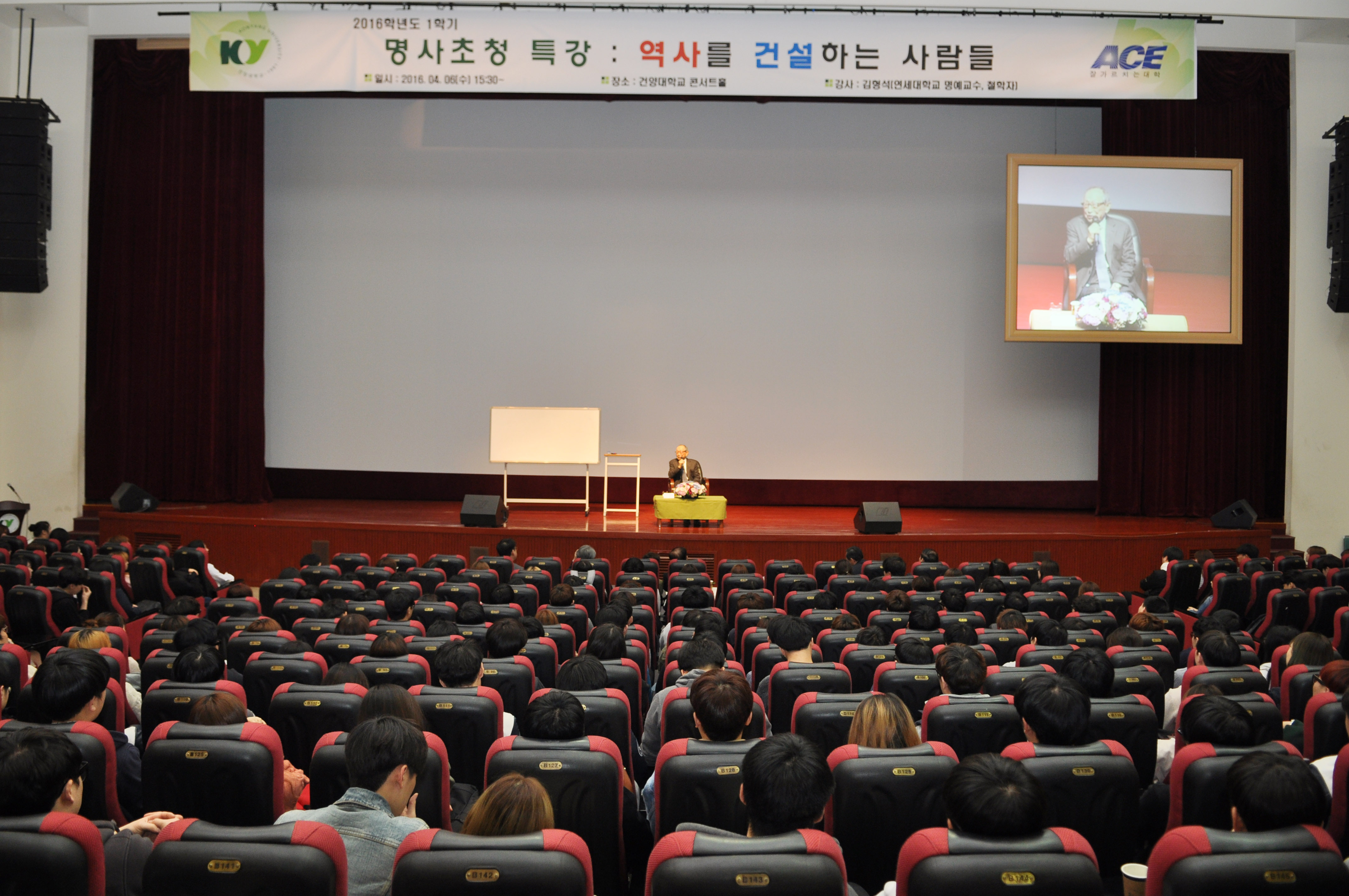 철학자 김형석 교수(연세대학교 명예교수)가 6일 건양대학교(총장 김희수) 논산 창의융합캠퍼스를 방문해 1,200여명의 학생들과 교수들을 대상으로 특강을 진행했다. 1920년생으로 올해 97세인 김형석 교수는 ‘한국 철학계 1세대 교육자’이자 한우리독서문화운동본부 초대 회장을 지냈으며 고령인 지금도 활발히 저서활동과 강의를 병행하고 있는 우리나라 철학계의 거두로 평가받고 있다. 이날 김형석 교수는 특강을 듣기 위해 모인 1,200여명의 학생과 교수들에게 행복한 인생을 살기 위한 방법에 대해 강의했다. 이번 특강은 건양대의 교수-학생 간 협동프로그램인 파트너십트레이닝 명사초청의 일환으로 진행됐다. 김형석 교수는 “24세를 넘으면 서서히 늙어가기 시작한다. 계속 운동을 하고 특히 정신적 수양을 해야한다. 정신은 신체와 다르게 계속 성장을 할 수 있다”며 노력하지 않으면 성장은 머추고 사회에 버림을 받게 된다고 강조했다. 김형석 교수는 또 정신적인 건강에 가장 기본적인 것은 독서라며 독서는 정신적인 성장의 필수영양소이기 때문에 책을 곁에 두고 잠깐 잠깐씩이라도 거르지 말고 읽으라고 말했다. 이어 “20대에는 사람들의 생활이 비슷한데 중년기가 지나면서 행복한 사람, 불행한 사람, 성공하는 사람, 실패하는 사람이 나타나고 그것이 60대가 되면 아주 뚜렷해진다”며 행복해지기 위해서는 20대에는 용기있는 사람이 되어야하고 나이가 들면 뚜렷한 신념과 가치관이 있는 사람이 되길 바란다고 말했다. 마지막으로 김형석 교수는 행복은 행운이 따라야 오는 것이 아니라 선택과 노력의 댓가라고 밝혔다. 그는 “행복은 만드는 것이지 주어지는 것이 아니다. 인생을 내버리지 말고 행복을 끌어올리는 생활을 하길 바란다”라는 마지막 말로 강의의 끝을 맺었다.