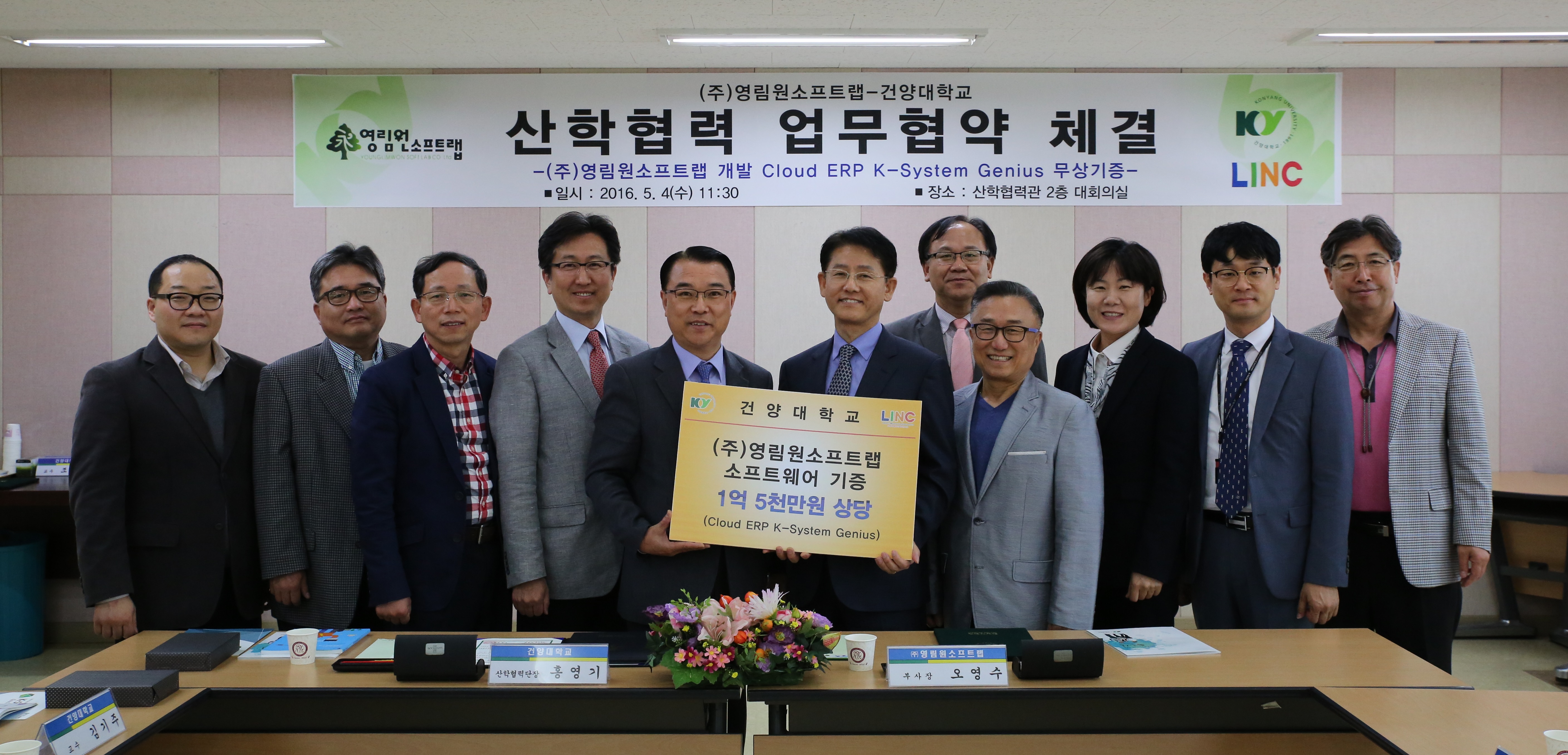 건양대학교(총장 김희수)는 16일 ERP솔루션 공급업체인 영림원소프트랩과 산·학 협력의 효율적 추진을 위한 업무협약을 체결했다고 밝혔다. 협약식은 이날 건양대 논산 창의융합캠퍼스 산학협력관 대회의실에서 홍영기 산학협력단장과 오영수 영림원소프트랩 부사장 등이 참석한 가운데 열렸으며, 양 기관은 학생 직무능력 교육 및 취업지원을 위해 상호 협력체계를 구축하기로 했다. 특히 영림원소프트랩은 건양대가 기업에서 요구하는 경쟁력 있는 인재를 양성해 능력중심사회 기반 조성에 기여할 수 있도록 자사에서 개발한 1억 5천만원 상당의 Cloud ERP K-System 'Genius' 프로그램을 건양대에 무상 기증하기로 했다. 또한 건양대 관련학과 학생들의 직무능력 교육을 위해 상호 협조하고, 우수학생의 현장실습 및 취업지원을 위해 적극 노력하기로 했다. 홍영기 산학협력단장은 "이번 협약이 학생 취업률 증가와 산학협력 활성화에 큰 도움이 될 것으로 기대된다"며, "앞으로 대학에서도 기업이 원하는 맞춤형 인재를 키워내도록 더욱 노력할 것이며 영림원소프트랩과 신뢰와 협력을 바탕으로 좋은 성과를 만들어 내겠다”고 밝혔다. 오영수 부사장은 "기업의 경영 효율화를 위한 수단인 ERP는 기업 전반의 업무 프로세스를 통합적으로 관리하고, 경영 상태를 실시간으로 파악해 정보를 공유하게 함으로써 빠르고 투명한 업무처리 실현을 목적으로 하고 있다"며, "학교에 기증한 ERP솔루션을 활용해 학생들의 개인능력 향상은 물론 우리 회사를 포함해 좋은 직장에 취업할 수 있는 기회가 많아지길 기대한다"고 말했다.