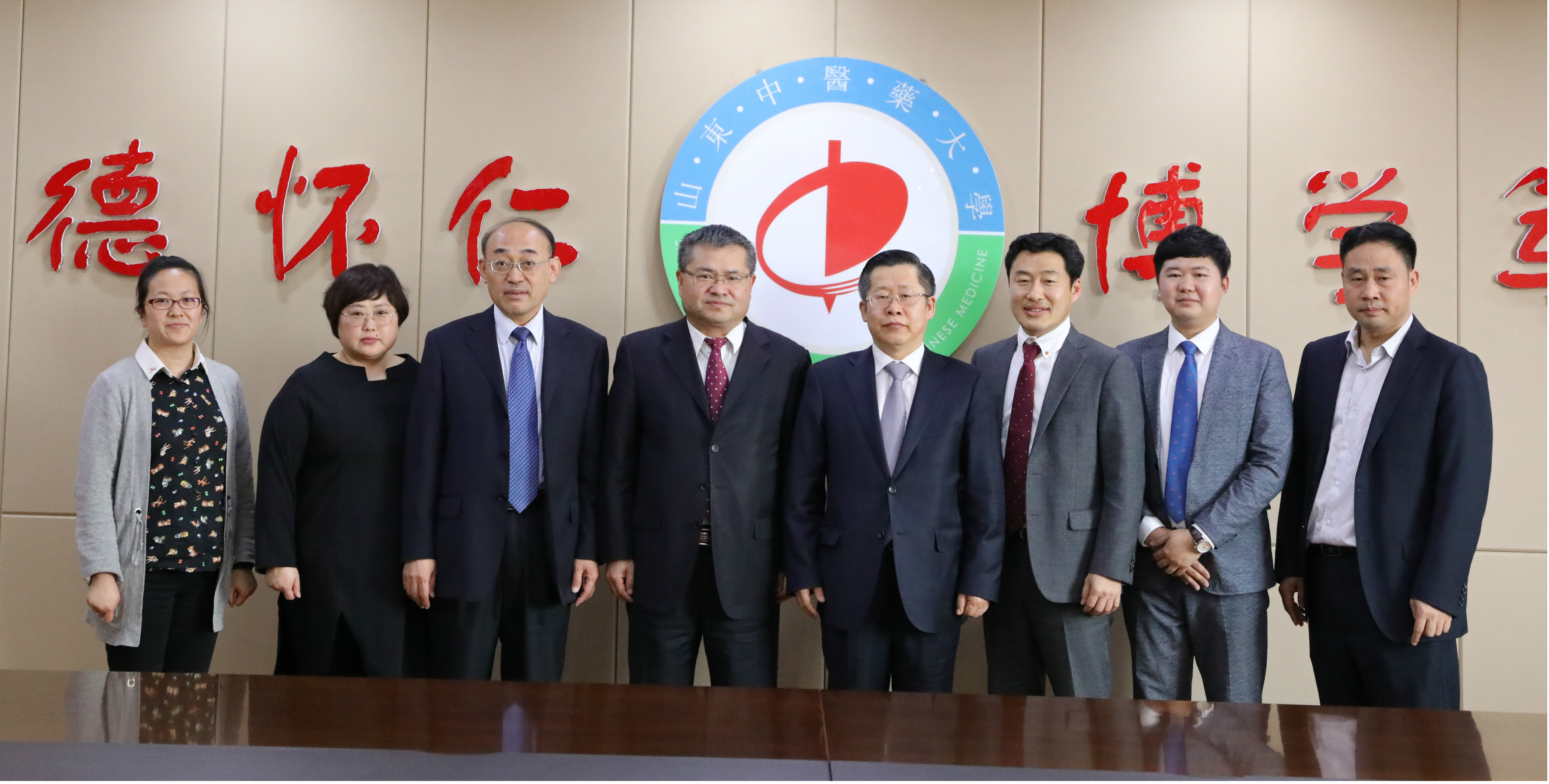 <사진설명> 30일 중국 산둥중의약대학에서 건양대가 보건복지대학원 물리치료학과 근골격계 물리치료전공 석사과정 중 교과과정을 포함한 교육시스템을 산둥중의약대학에 적용 및 지원키로 하는 내용의 업무협약 체결식을 갖는 모습. 왼쪽부터 네 번째 장성박 중국 산둥중의약대학 부총장, 다섯 번째 이무식 건양대 보건복지대학원 원장, 여섯 번째 건양대 이병권 물리치료학과 교수, 일곱 번째 건양대 국제교육원 교언림 씨 순.