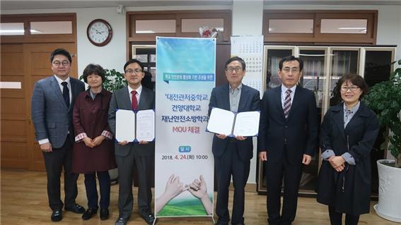 건양대학교(총장 정연주) 재난안전소방학과는 24일 대전 관저중학교(교장 장명신)와 학교 안전문화 활성화 기반조성을 위한 재난안전소방 교육 프로그램 및 안전체험 프로그램 공동 운영 등을 골자로 하는 재난안전소방교육에 대한 협약식을 가졌다.