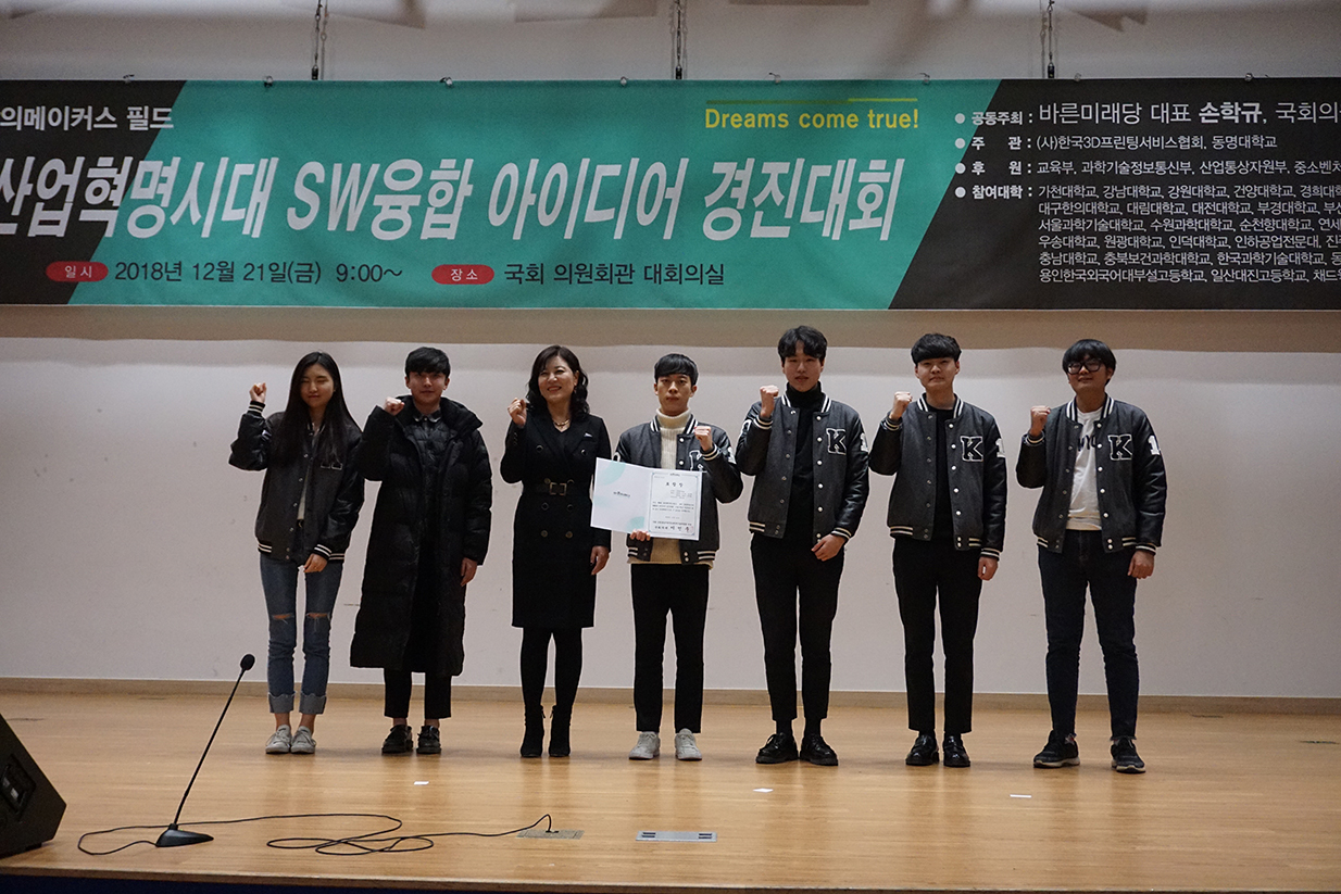 건양대학교(총장 이원묵) 의료신소재학과 교수와 학생들이 제8회 창의메이커스필드 ‘4차 산업혁명시대 SW융합 경진대회에서 국회의원상을 수상했다.