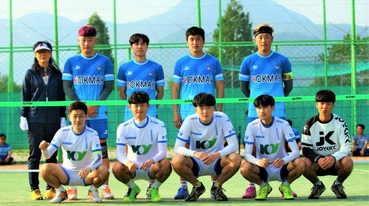 기념촬영을 하고 있는 건양대학교 족구단과 하남호크마.jpg