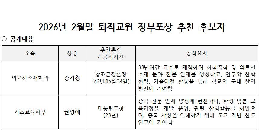 | 제목 | 2026년 2월말 퇴직교원 정부포상 추천 대상자 공개검증 | ||||