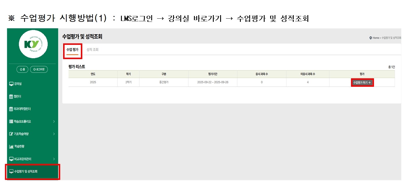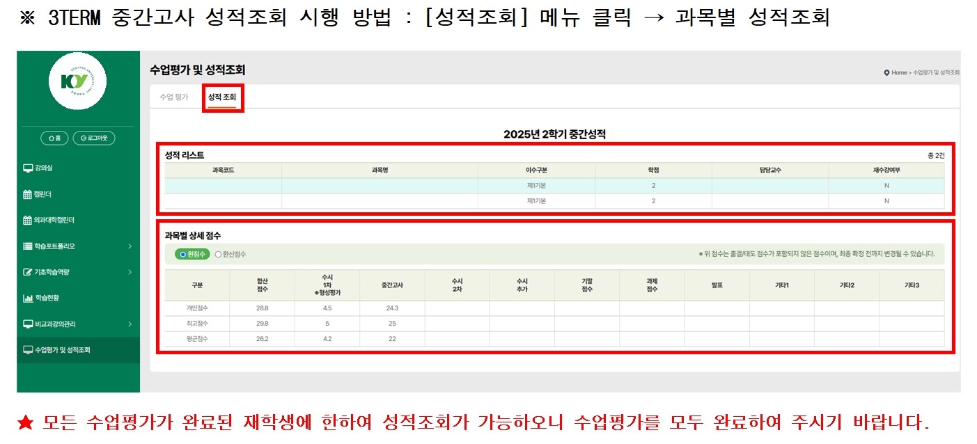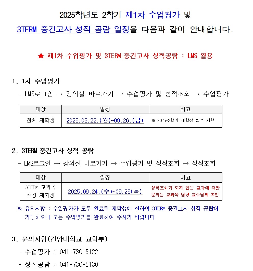| 제목 | 2025학년도 2학기 제1차 수업평가 및 3TERM 중간고사 성적공람 일정 안내 | ||||
