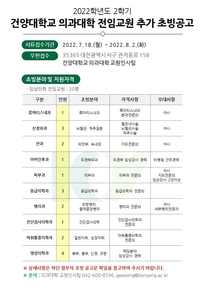 | 제목 | 2022-2학기 의과대학 전임교원 추가 초빙공고 | ||||
