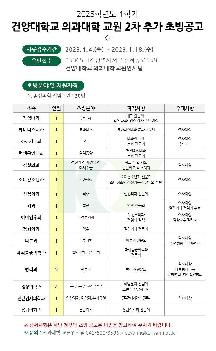 | 제목 | 2023학년도 1학기 건양대학교 의과대학 전임교원 2차 추가 초빙공고 | ||||