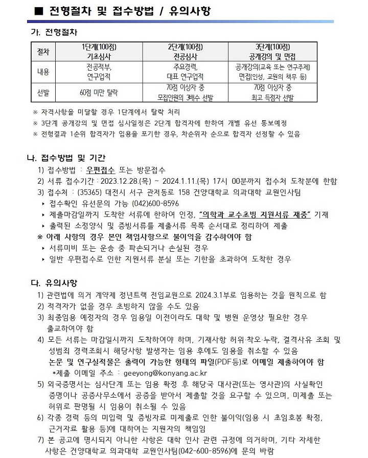 | 제목 | 2024학년도 1학기 건양대학교 의과대학 교원 2차 추가 초빙공고 | ||||