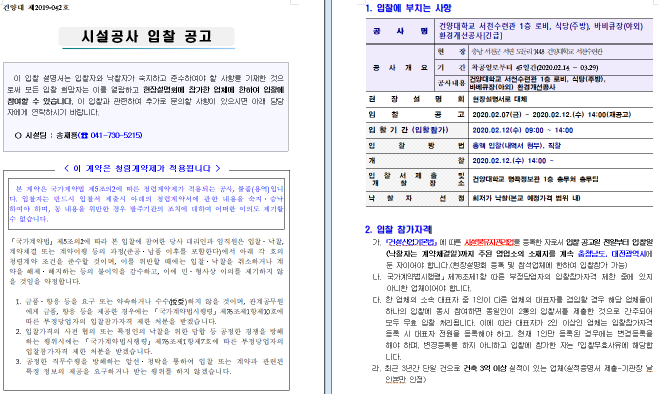 | 제목 | (2019-042호)건양대학교 서천수련관 1층 로비, 식당(주방), 바비큐장(야외) 환경개선공사 입찰 수정 재공고 | ||||
