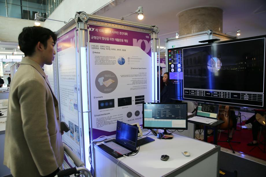 이날 전시회에서 가칭 ‘밸런스 시스템’이라는 이름의 노약자 및 재활환자를 위한 무게중심 측정 및 게임을 개발해 전시한 의료IT공학과 정홍봉/최이주/이하림(2학년) 씨는 “우리가 흔히 오락실에서 보는 슈팅게임을 하는데 손으로 조절하는 게 아니라 압력판 위에 올라가 발로 무게중심을 이동해 겨냥하게 하는 프로그램을 개발했다”고 밝히며 “개발 단가를 낮췄기 때문에 대학병원이 아닌 일반 요양원이나 재활병원에서도 쉽게 구입해 활용할 수 있도록 상품화시킬 예정”이라고 말했다.