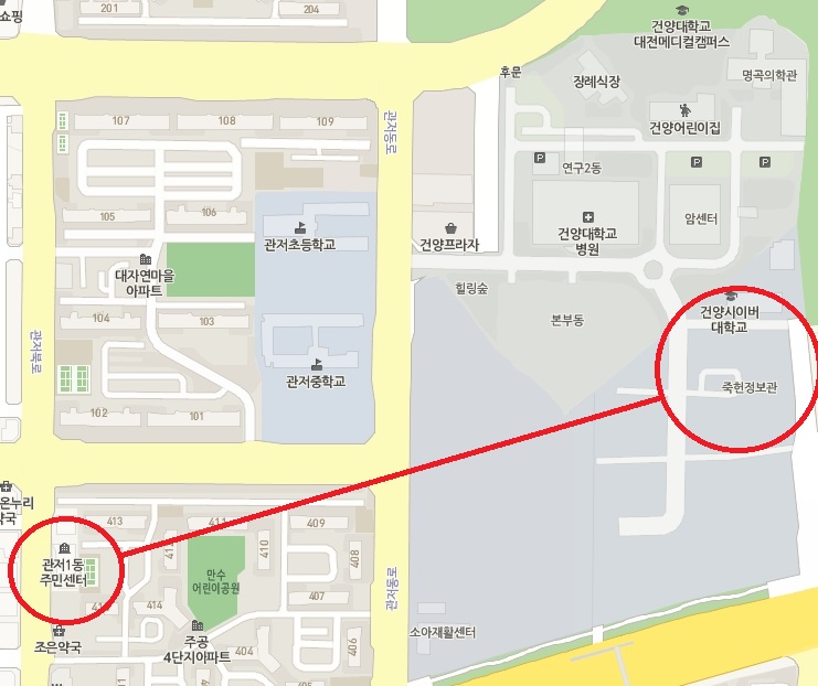 대전광역시 서구 관저북로 24 (관저동) 관저1동주민센터 (학교에서 약 1.2 km)