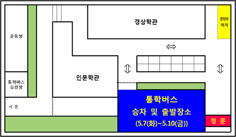 2019학년도 축제기간동안 논산캠퍼스 통학버스 승차 및 출발장소를 아래와 같이 변경 운행하오니 차질 없으시기 바랍니다.