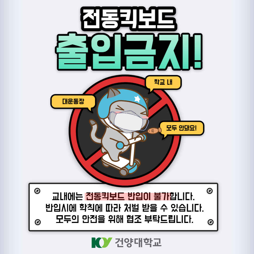 우리대학은 개인형 이동장치(전동킥보드, 전동휠 등) 관련 사고를 미연에 방지하기 위해 현재 출입을 금지 및 제한하고 있습니다.
